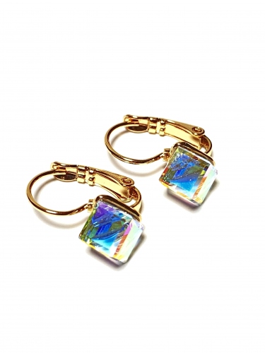 NÁUŠNICE V BARVĚ 18K ZLATA S DUHOVÝM KRYSTALEM VE TVARU KOSTKY (AB EFEKT)